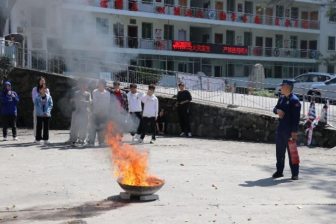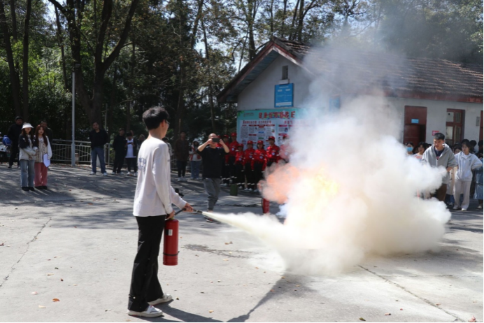 讲座结束后,张海滨组织师生在校医院门口的空地上进行灭火器使用的实践教学。师生积极主动地尝试使用灭火器,初步掌握了基本地灭火方法。